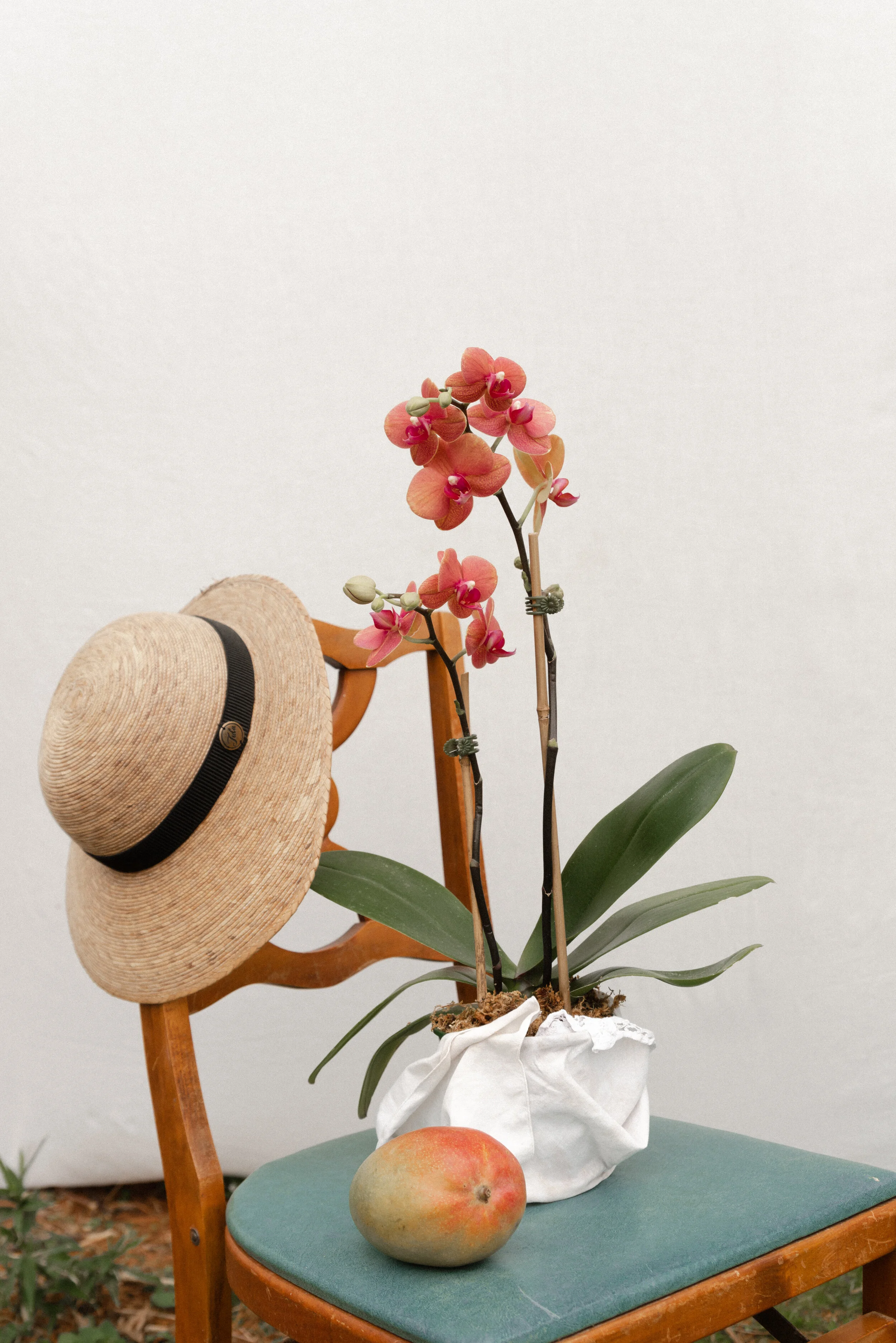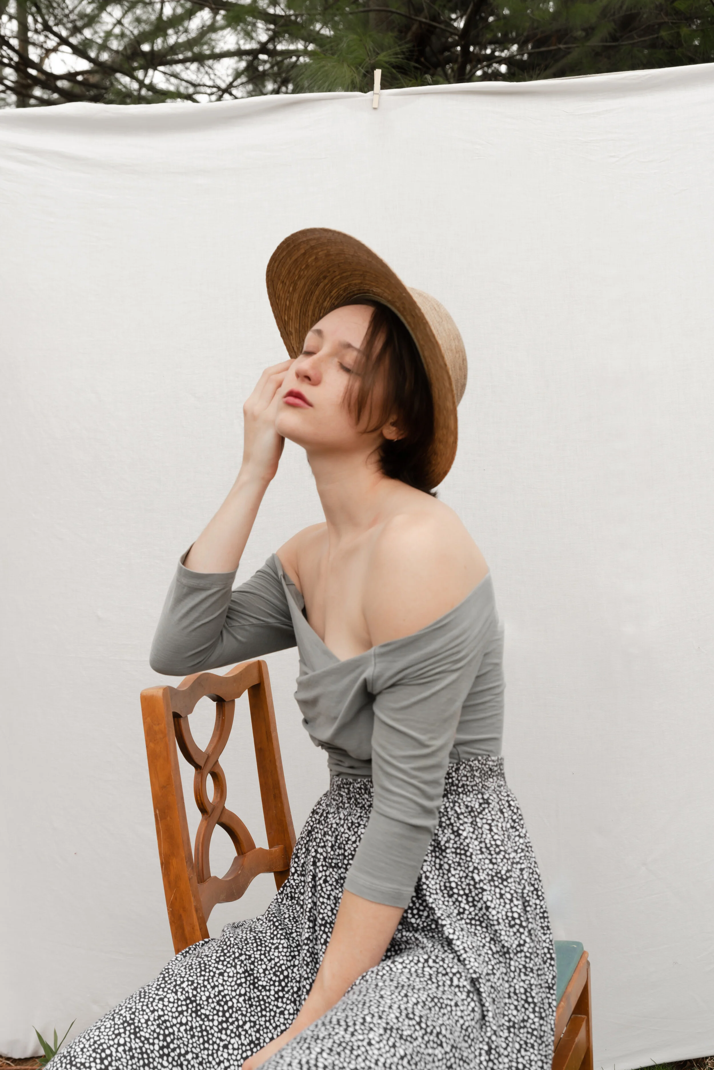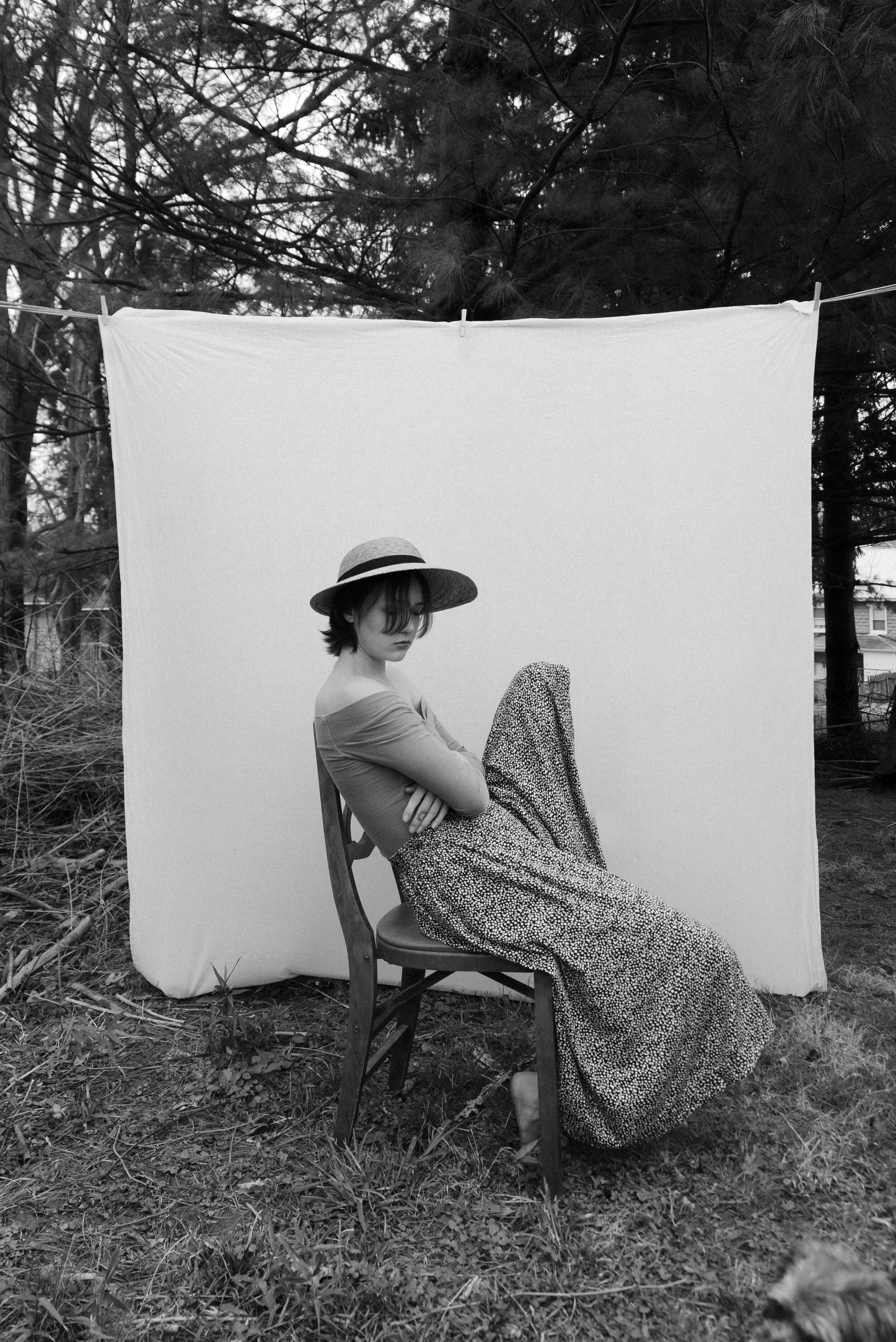 To be honest, I’m like 60% introverted so I’m kinda excited to have a lot of extra time on my plate. I have a few ambitions for this slow period, such as more personal photography sessions involving self portraits, still life set ups, and food photography. I’ve actually already started which is why I’m blogging in the first place; just the other day it reached 80 degrees outside so I set up a mini portrait session for myself. It was so nice outside so I put on some of my favorite spring clothes (which I purchased from Goodwill- I love Goodwill) and dragged out my new orchid and a chair that belonged to Cullen’s great grandmother. We have a cheap clothing line in our backyard so I took an rugged old white sheet and pinned it to the line to create and outdoor “studio”. I have 4 fur babies (2 cats: Mona and Jo) and 2 dogs (Poppy and Olive); they were all there, sitting beside my tripod, watching me photograph myself. Mona, my one cat, actually popped in during the session at one point (she is the one photographed below).